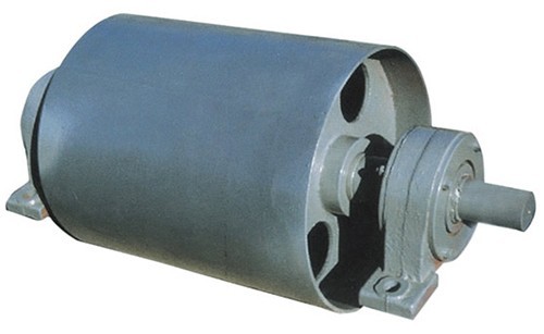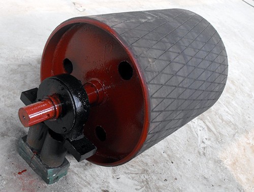傳動滾筒是輸送機傳遞動力的部件。其驅動帶式輸送機的方式有單滾筒、雙滾筒及多滾筒之分。單滾筒多用于功率不太大的輸送機上,如煤礦地面運輸及選煤廠等處。井下帶式輸送機一般均采用雙滾筒,以使輸送機結構緊湊。傳動滾筒表面有裸露光鋼面,人字形和菱形花紋橡膠覆面。小功率、小帶寬及環(huán)境干燥時可采用裸露光鋼面。人字形花紋膠面摩擦系數大,防滑性和排水性好,但有方向性。菱形膠面用于雙向運行的輸送機。